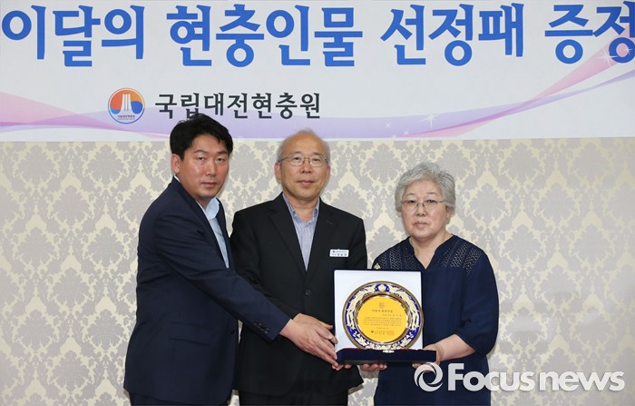 (대전=포커스뉴스) 9일 오후 대전 유성구 국립대전현충원에서 열린 '이달의 현충인물 선정패 증정식'에서 베를린 올림픽 마라톤 금메달리스트 손기정 선수의 딸 손문영(오른쪽) 여사와 외손자 이준승 손기정기념재단 사무총장이 권율정(가운데) 대전현충원장과 기념 촬영을 하고 있다.