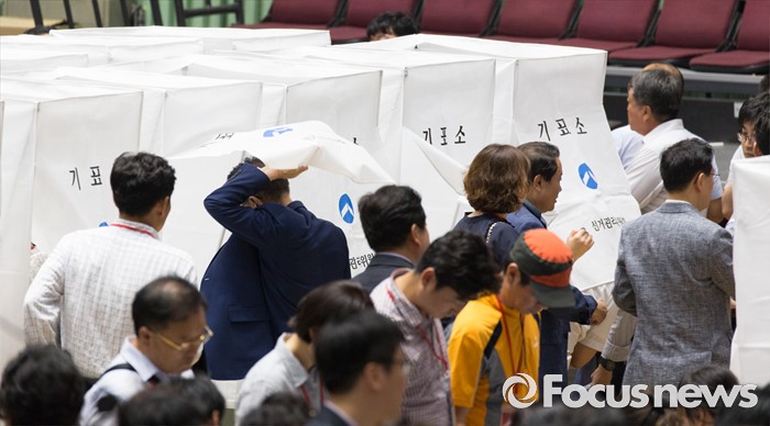 (서울=포커스뉴스) 9일 오후 서울 송파구 잠실실내체육관에서 열린 제4차 새누리당 전당대회에서 당원들이 당대표 및 최고위원을 선출하기 위해 투표를 하고 있다.