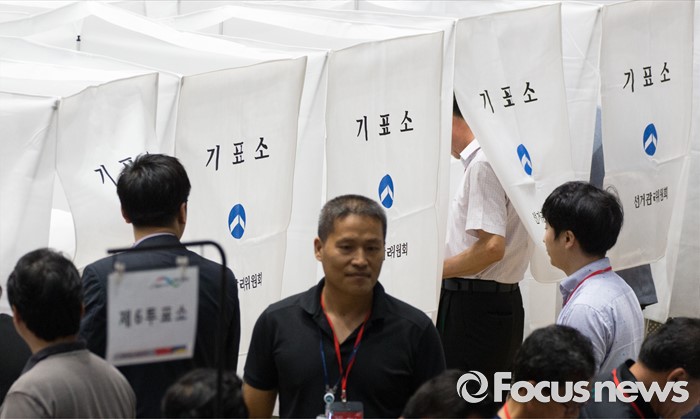 (서울=포커스뉴스) 9일 오후 서울 송파구 잠실실내체육관에서 열린 제4차 새누리당 전당대회에서 당원들이 당대표 및 최고위원을 선출하기 위해 투표를 하고 있다.