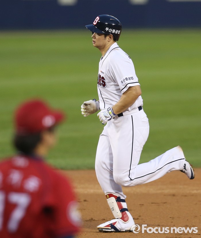 (서울=포커스뉴스) 9일 서울 잠실구장에서 열린 2016 프로야구 KIA-두산 경기 2회말 1사 1,3루에서 두산 김재환이 KIA 투수 한기주의 초구를 받아쳐 우월 3점 홈런을 날리고 베이스를 돌고 있다.