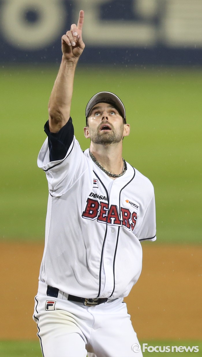 (서울=포커스뉴스) 9일 서울 잠실구장에서 열린 2016 프로야구 KIA-두산 경기 6회초 2사 1루에서 두산 투수 니퍼트가 KIA 이범호의 파울 타구를 가리키고 있다.