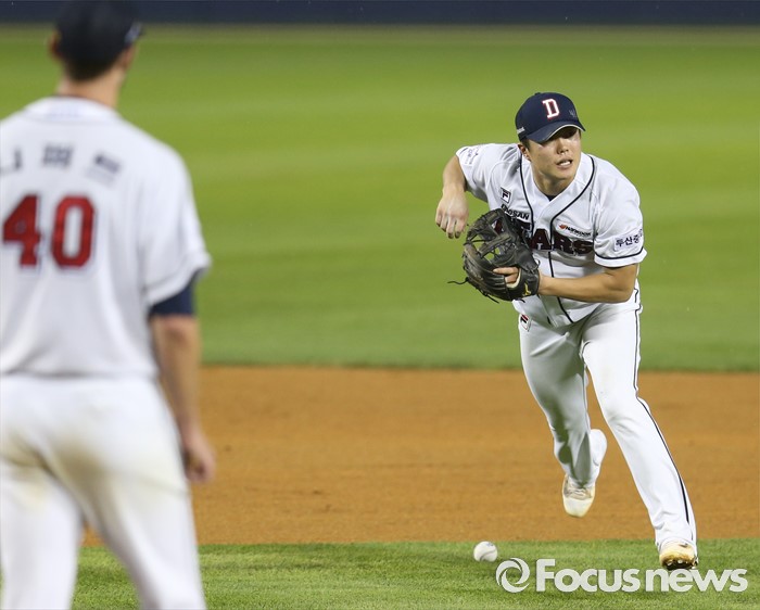 (서울=포커스뉴스) 9일 서울 잠실구장에서 열린 2016 프로야구 KIA-두산 경기 6회초 1사후 두산 유격수 류지혁이 KIA 윤정우의 내야땅볼 타구를 놓치고 있다.