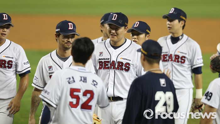 (서울=포커스뉴스) 9일 서울 잠실구장에서 열린 2016 프로야구 KIA-두산 경기에서 KIA를 물리치고 화요일 경기 18연승 기록을 세우고 선수들이 환한 표정으로 더그아웃으로 향하고 있다.
