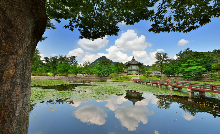 문화재청 측은 "이번 전면 개방을 통해 폭염의 무더위를 시원하게 해줄 고궁과 왕릉의 나무그늘 아래서 '빛을 되찾은 날'인 광복절의 의미를 다시 한 번 되새기고 독립을 위해 희생한 민족 열사들을 기리는 날이 될 수 있기를 기대한다"고 밝혔다.경복궁 향원정 전경.<사진제공=문화재청>