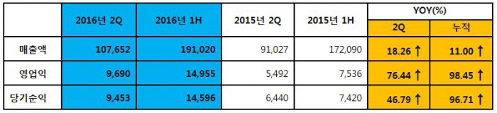 아울러 2분기 당기순이익도 지난해 동기 대비 47% 증가한 95억원을 기록했고, 상반기 누적 당기순이익 역시지난해 상반기 대비 97% 늘어난 146억원을 나타냈다.