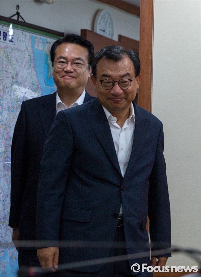 (서울=포커스뉴스) 이정현 새누리당 대표와 정진석 원내대표가 10일 오전 서울 여의도 새누리당사에서 열린 최고위원회의에 참석하기 위해 회의실로 들어서고 있다.