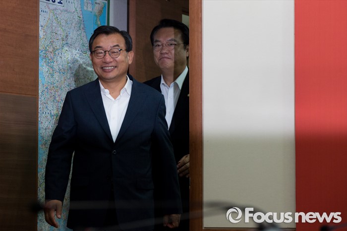 (서울=포커스뉴스) 이정현 새누리당 대표와 정진석 원내대표가 10일 오전 서울 여의도 새누리당사에서 열린 최고위원회의에 참석하기 위해 회의실로 들어서고 있다.