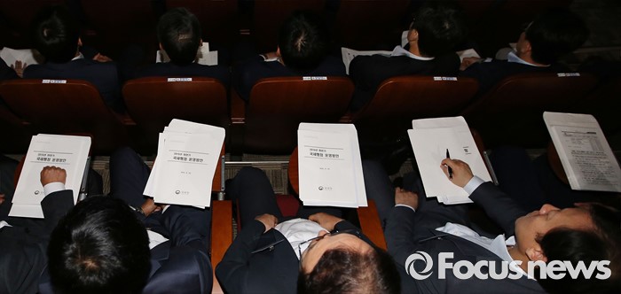 (세종=포커스뉴스) 10일 오전 세종시 정부세종2청사 국세청에서 열린 전국세무관서장회의에서 참석자가 국세행정 운영방안 자료를 살피고 있다.
