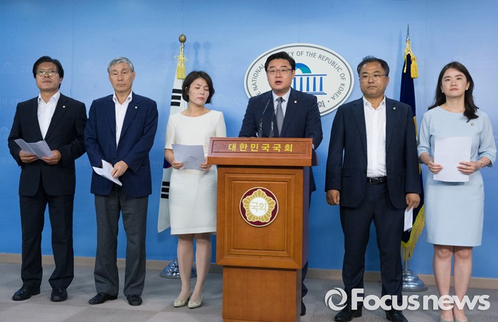 (서울=포커스뉴스) 새누리당 초선 의원들이 10일 오전 서울 여의도 국회 정론관에서 더불어민주당 초선 의원들의 방중 관련 기자회견을 하고 있다. 왼쪽부터 송석준, 조훈현, 전희경, 김성원, 권석창, 신보라 의원.