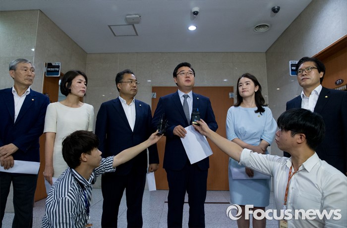 (서울=포커스뉴스) 새누리당 초선 의원들이 10일 오전 서울 여의도 국회 정론관에서 더불어민주당 초선 의원들의 방중 관련 기자회견을 마친 뒤 취재진 질문에 답하고 있다. 왼쪽부터 조훈현, 전희경, 권석창, 김성원, 신보라, 송석준 의원.