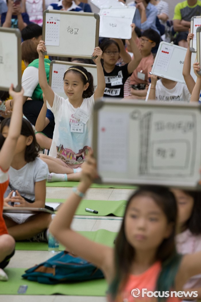(서울=포커스뉴스) 10일 오전 서울 성동구 성동구청 대강당에서 열린 '성동 어린이 독서 골든벨'에서 초등학생들이 정답판을 들고 있다.