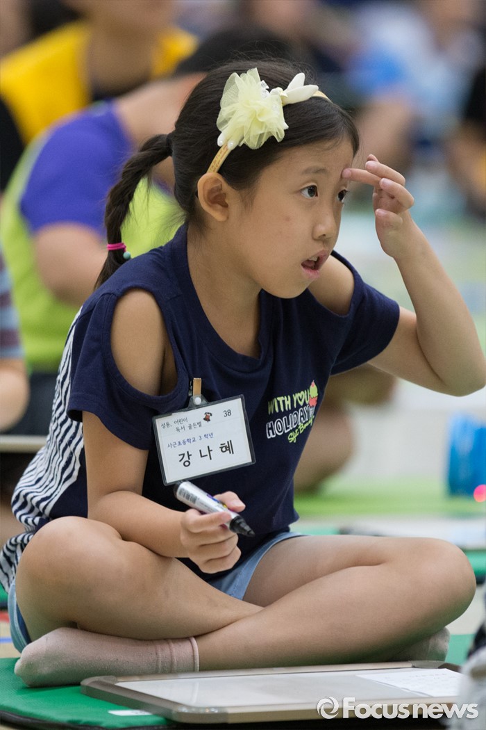 (서울=포커스뉴스) 10일 오전 서울 성동구 성동구청 대강당에서 열린 '성동 어린이 독서 골든벨'에서 초등학생들이 문제를 풀고 있다.