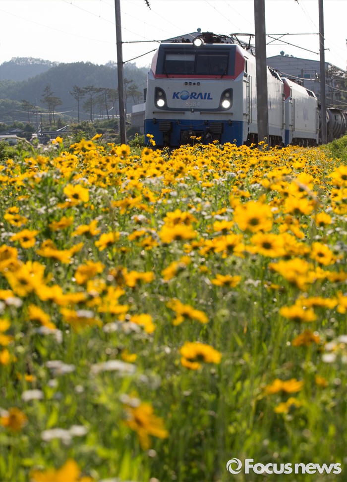 홍순만 코레일 사장은 "명절을 맞아 열차를 이용해 고향을 찾는 고객이 원활히 승차권을 예매할 수 있도록 최선을 다하겠다"며 "승차권은 반드시 지정된 역 창구와 대리점, 레츠코레일 홈페이지에서 구매해 달라"고 당부했다.(충주=포커스뉴스) 충북 충주시 장성리에서 금계국 사이로 열차가 지나고 있다. 2016.06.02 김기태 기자