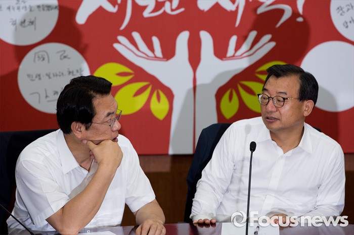 (서울=포커스뉴스) 이정현(오른쪽) 새누리당 대표와 정진석 원내대표가 10일 오전 서울 여의도 새누리당사에서 열린 최고위원회의에 참석해 대화 하고 있다.
