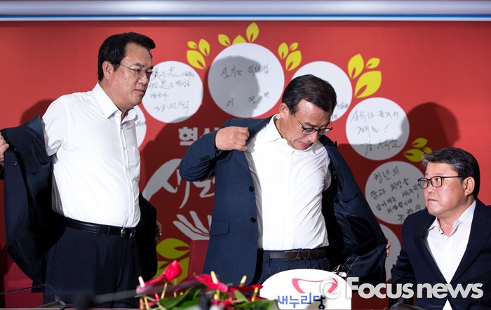 (서울=포커스뉴스) 이정현(가운데) 새누리당 대표와 정진석 원내대표가 10일 오전 서울 여의도 새누리당사에서 열린 최고위원회의에 참석해 회의에 앞서 양복 상의를 벗고 있다.