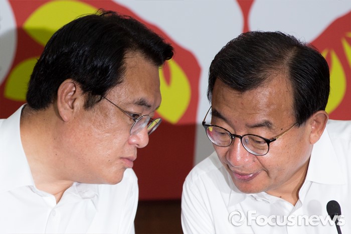 (서울=포커스뉴스) 이정현(오른쪽) 새누리당 대표와 정진석 원내대표가 10일 오전 서울 여의도 새누리당사에서 열린 최고위원회의에 참석해 대화 하고 있다.