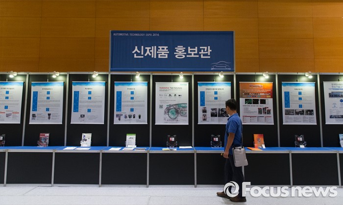 (서울=포커스뉴스) 10일 오후 서울 강남구 코엑스에서 열린 '2016 오토모티브 테크놀로지 엑스포'을 찾은 한 관람객이 신제품 홍보관을 둘러보고 있다.