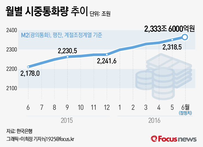 (서울=포커스뉴스) 10일 한국은행이 공개한 '2016년 6월 중 통화 및 유동성 동향'에 따르면 6월 시중통화량(M2·광의통화)은 2333조6000억원(계절조정치·평잔)으로 전년 동월 대비 7.2% 증가했다.