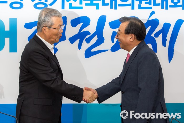| △ 악수하는 김종인 대표-이정현 대표 |