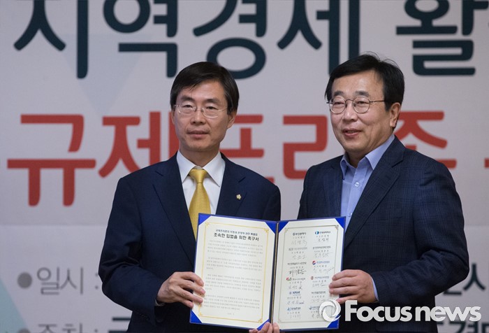 (서울=포커스뉴스) 10일 오후 서울 여의도 국회 사랑재에서 열린 지역경제 활성화를 위한 규제프리존 특별법 왜 필요한가? 간담회에 참석한 조경태(왼쪽) 기획재정위원장이 서병수 부산시장으로부터 조속한 입법 촉구서를 전달받고 있다.