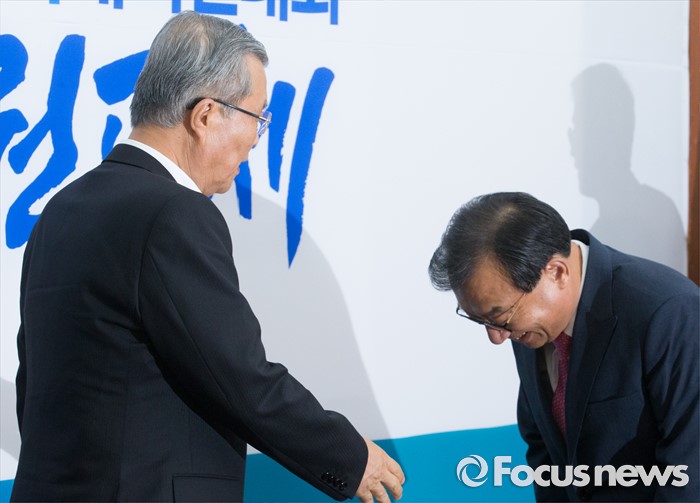 (서울=포커스뉴스) 10일 오후 서울 여의도 국회에서 이정현(오른쪽) 새누리당 신임 대표가 김종인 더불어민주당 비대위 대표와 만나 면담에 앞서 인사하고 있다.