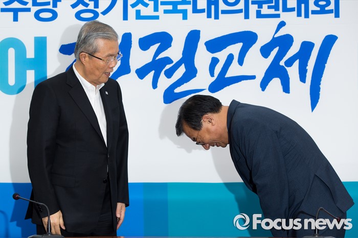 (서울=포커스뉴스) 이정현(오른쪽) 새누리당 대표가 10일 오후 서울 여의도 국회에서 김종인 더불어민주당 비상대책위 대표 예방에 앞서 인사 하고 있다.