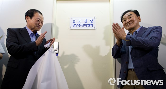 (서울=포커스뉴스) 10일 오후 서울 종로구 대한변호사회관에서 이재오(오른쪽), 최병국 전 의원이 중도신당 창당추진위원회 사무실 입주 및 현판식을 하고 있다.