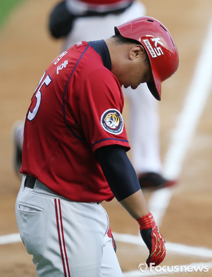 | △ 볼에 맞고 나가는 KIA 이범호 |