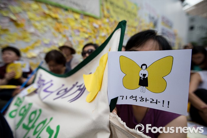 정대협은 세계 일본군 위안부 기림일인 14일 오후 5시 같은 장소에서 공연 형식의 '나비 문화제'를 열 예정이다. 이날은 위안부 피해자인 고(故) 김학순 할머니가 1991년 8월14일 처음으로 피해 증언을 한 날을 기리는 날이다.지난 3일 오후 서울 종로구 구 일본대사관 앞에서 열린 '제1242차 일본군 위안부 문제해결을 위한 정기 수요집회'에 참석한 시민들이 문제해결을 촉구하며 손 피켓을 들고 있다. 2016.08.03 이승배 기자