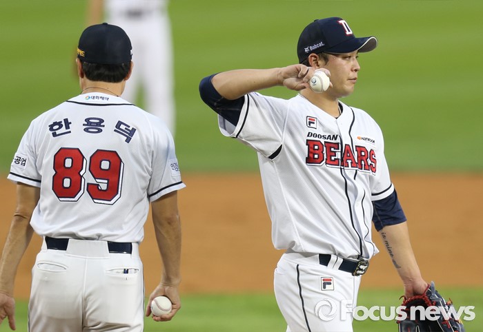 | △ 마운드 내려가는 두산 투수 안규영 |
