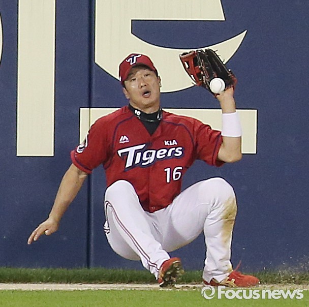 타구잡다 뒤로 넘어지는 KIA 좌익수 김주찬