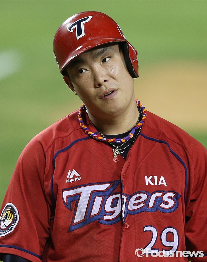 (서울=포커스뉴스) 10일 서울 잠실구장에서 열린 2016 프로야구 KIA-두산 경기 6회초 2사 만루에서 KIA 나지완이 주심의 스트라이크 판정에 고개를 갸우뚱하고 있다.