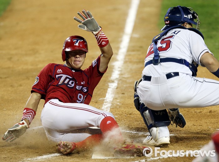 (서울=포커스뉴스) 10일 서울 잠실구장에서 열린 2016 프로야구 KIA-두산 경기 7회초 2사 1루에서 KIA 서동욱의 우익수를 넘기는 2루타때 1루주자 노수광이 홈까지 달려 슬라이딩하며 세이프되고 있다.