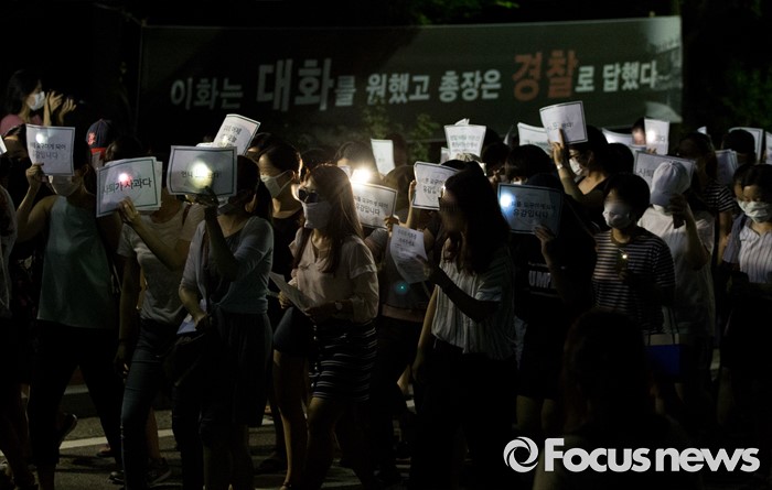 (서울=포커스뉴스) 10일 오후 서울 서대문구 이화여대에서 재학생 및 졸업생들이 최경희 총장의 사퇴를 요구하며 행진을 하고 있다.