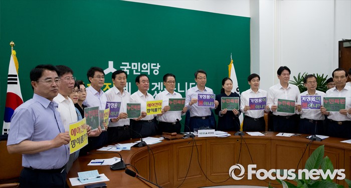 (서울=포커스뉴스) 11일 오전 서울 여의도 국회에서 열린 국민의당 원내정책회의에 참석한 박지원 비상대책위원장과 김성식 정책위의장 등 의원들이 전기요금 누진제 개선을 촉구하는 퍼포먼스를 하고 있다.