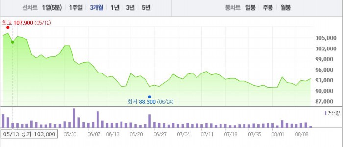 카카오 측은 “올 2분기부터 로엔엔터테인먼트의 실적이 연결재무제표에 반영됐다”고 설명했다.주가흐름<사진출처=네이버 캡쳐>