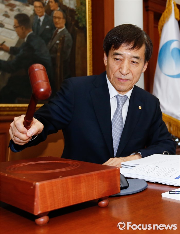 (서울=포커스뉴스) 11일 오전 서울 중구 한국은행에서 열린 제15차 금융통화위원회에 참석한 이주열 한국은행 총재가 개회를 알리는 의사봉을 두드리고 있다.