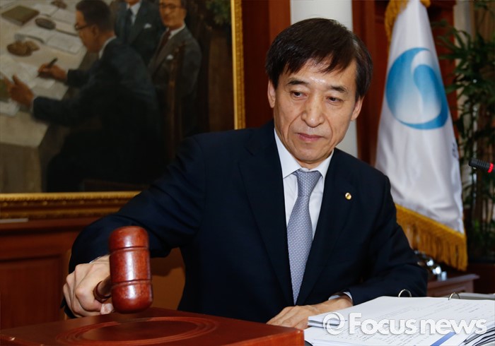 (서울=포커스뉴스) 11일 오전 서울 중구 한국은행에서 열린 제15차 금융통화위원회에 참석한 이주열 한국은행 총재가 개회를 알리는 의사봉을 두드리고 있다.