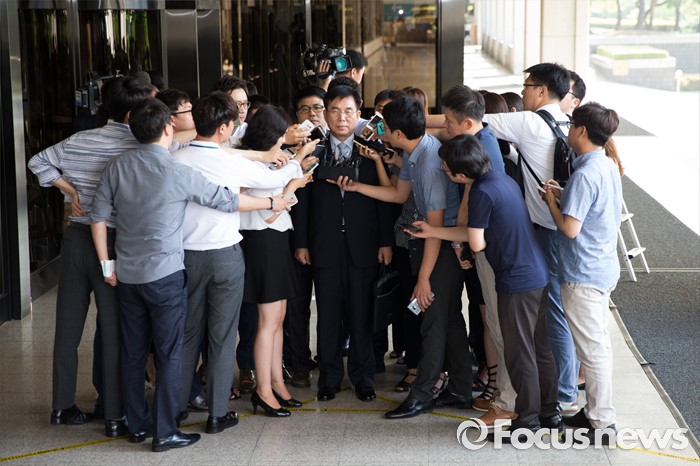 (서울=포커스뉴스) 법인세 등 부정 환급 의혹을 받고 있는 허수영 롯데케미칼 사장이 11일 오전 서울 서초구 서울중앙지검으로 출석해 취재진의 질문을 받고 있다.