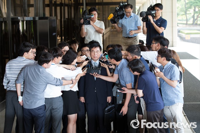 (서울=포커스뉴스) 법인세 등 부정 환급 의혹을 받고 있는 허수영 롯데케미칼 사장이 11일 오전 서울 서초구 서울중앙지검으로 출석해 취재진의 질문을 받고 있다.