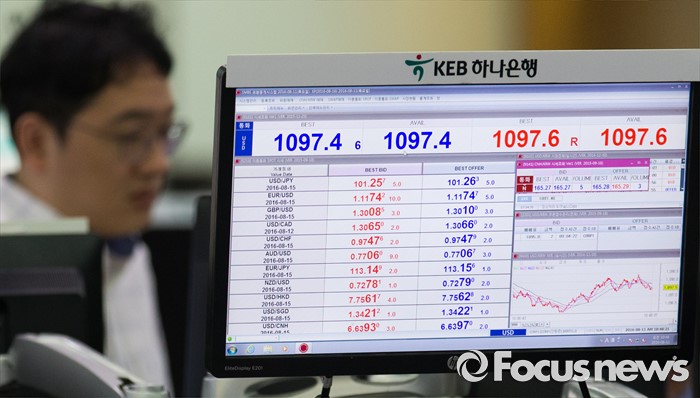 (서울=포커스뉴스) 11일 오전 서울 중구 KEB 하나은행 딜링룸에서 한 딜러가 업무를 보고 있다.