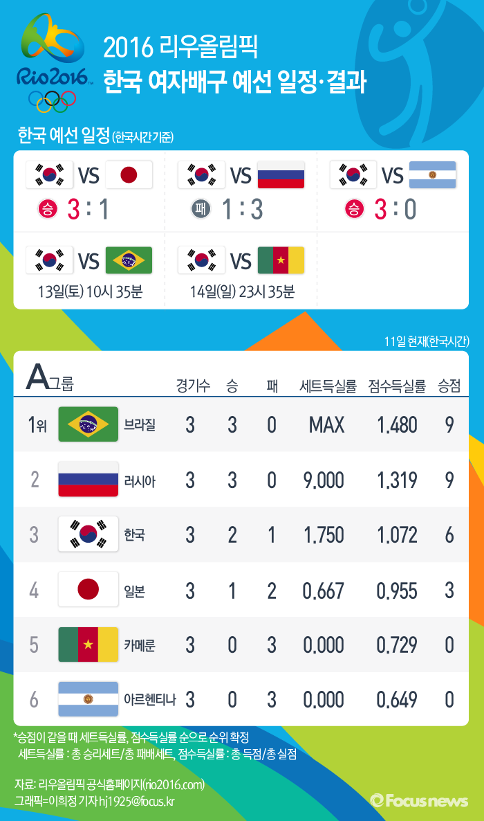 | △ [그래픽] 2016 리우올림픽 한국 여자배구 예선 일정·결과 |