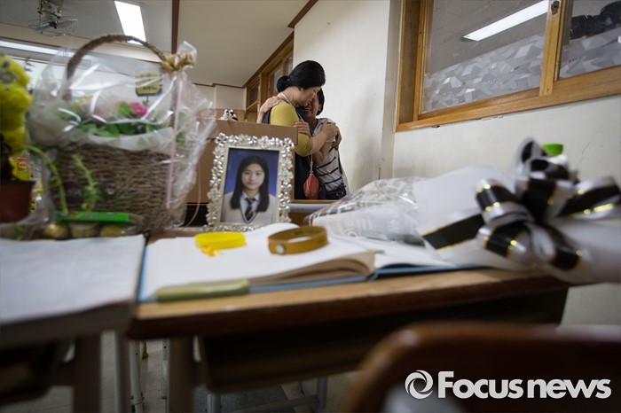 (안산=포커스뉴스) 세월호 참사에서 희생된 단원고등학교 학생들의 교실 이전 절차가 진행 중인 11일 오전, 경기도 안산시 단원고등학교 기억교실에서 희생 아이들 가족들이 부등켜 안고 서로를 위로하고 있다.