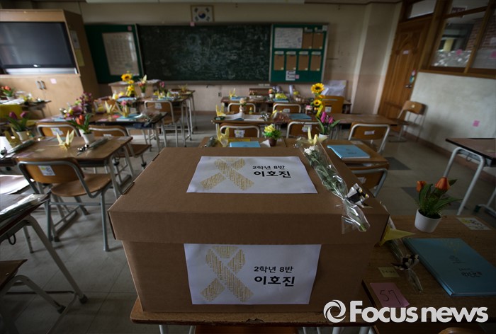 (안산=포커스뉴스) 세월호 참사에서 희생된 단원고등학교 학생들의 교실 이전 절차가 진행 중인 11일 오전 경기도 안산시 단원고등학교 기억교실에 세월호 참사 당시 2학년 8반이었던 고 이호진 학생의 유품상자가 놓여져 있다.