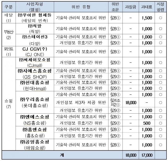 우아한 형제들, 직방, 스테이션3, 씨제이씨지브이, 지에스 홈쇼핑, 현대홈쇼핑, 우리홈쇼핑(채널명 롯데홈쇼핑), 엔에스쇼핑, 홈앤쇼핑, 공영홈쇼핑 등 10개 사업자에게는 각각 시정 명령과 과태료 1000만 원∼1500만원이 부과됐다. 스마트폰 앱 등에서 개인정보처리시스템으로 개인정보를 전송하는 구간에 대해 암호화 조치 등을 하지 않아 정보통신망법 제28조제1항(개인정보의 분실ㆍ도난ㆍ누출ㆍ변조 또는 훼손을 방지하기 위한 기술적ㆍ관리적 보호조치)을 위반한 혐의다.