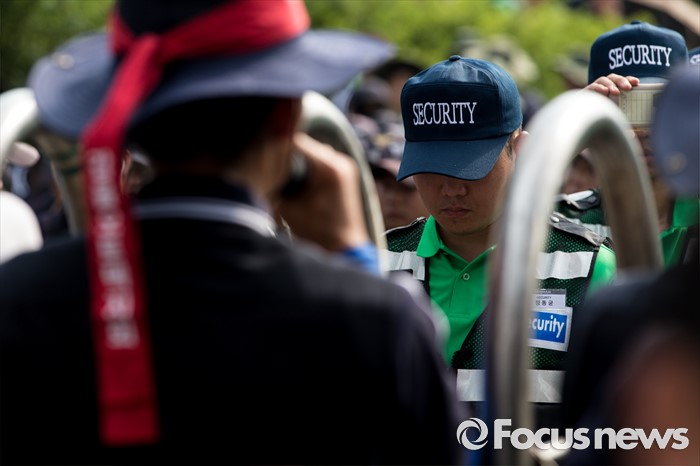 갑을오토텍 관계자는 "지금 현 상황에서 노사분규가 보다 장기화되고 최소한의 생산마저 이루어지지 않는다면 전 고객사의 이탈이 한층 가속화 될 것"이라며 "이 경우 회사의 의사와 무관하게 최악의 상황에 직면할 수 밖에 없는 것이 현재 우리가 처해 있는 냉혹한 현실이다"라고 전했다.(아산=포커스뉴스) 1일 오후 충남 아산 탕정면 갑을오토텍에서 노조원들과 사측 경비 용역들이 대치하고 있다. 2016.08.01 김인철 기자