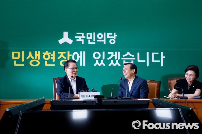 (서울=포커스뉴스) 11일 오후 서울 여의도 국회에서 박지원(왼쪽) 국민의당 비상대책위원장이 이정현(가운데) 새누리당 대표와의 면담을 하고 있다.