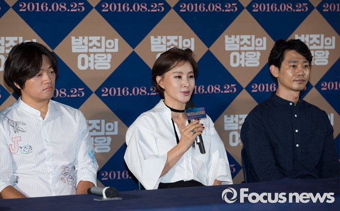 (서울=포커스뉴스) 11일 오후 서울 성동구 CGV 왕십리에서 열린 영화 '범죄의 여왕' 언론시사회에 참석한 배우 박지영이 취재진 질문에 답변하고 있다. 왼쪽부터 배우 조복래, 박지영, 김대현.
