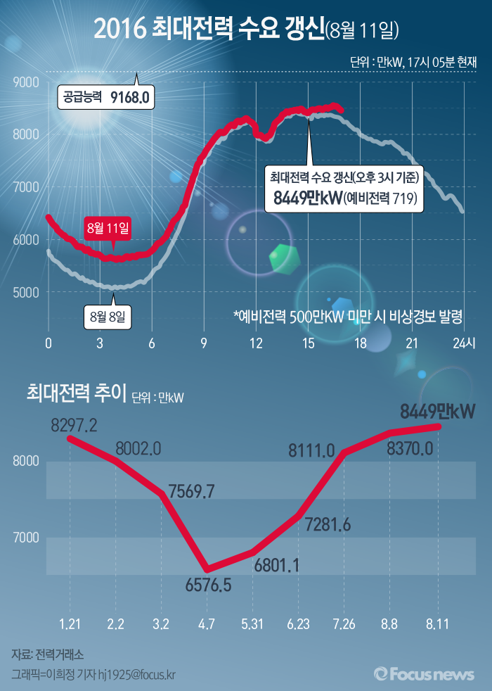 (서울=포커스뉴스) 산업통상자원부는 11일 오후 3시 기준 최대전력수요가 8449만㎾를 기록해 지난 8일 기록인 8370만㎾를 넘어섰다고 밝혔다. 최대전력 기록경신에도 불구, 예비전력은 719만㎾로 지난 8일 보다 높았다.