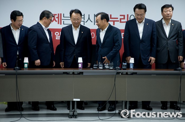 (서울=포커스뉴스) 11일 오후 서울 여의도 국회에서 열린 전기세 누진제 개편 긴급 당정 협의에 참석한 이정현 새누리당 대표, 정진석 원내대표, 유일호 경제부총리 겸 기획재정부 장관, 주형환 산업통상자원부 장관 등 참석자들이 취재진을 향해 포즈를 취한 뒤 자리에 앉고 있다. 왼쪽부터 이장우, 조원진 최고위원, 유 부총리, 이 대표, 정 원내대표, 주 장관.